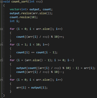 output[count[(arr[i] / exp) % 10] - 1] := arr[i]