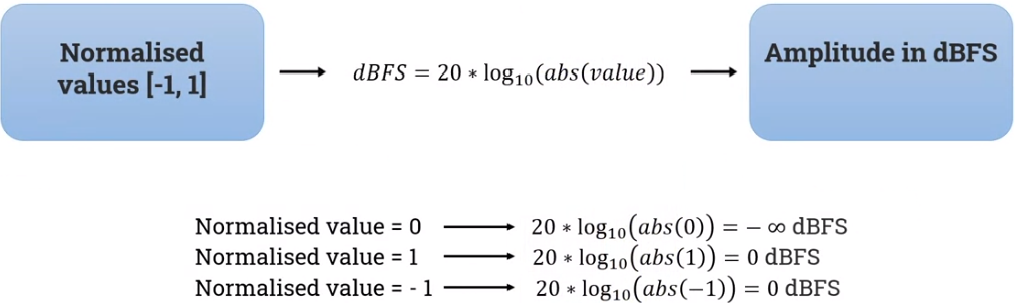 - Amplitude has normalised values between 1 and -1. In using the normalised values, we can find programs that in decibels or even in the sample values.
