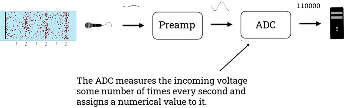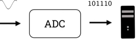 - ADC samples incoming analogue voltage at a specific rate and assigns a digital value to each sample. These digital values are then usable by the digital devices.