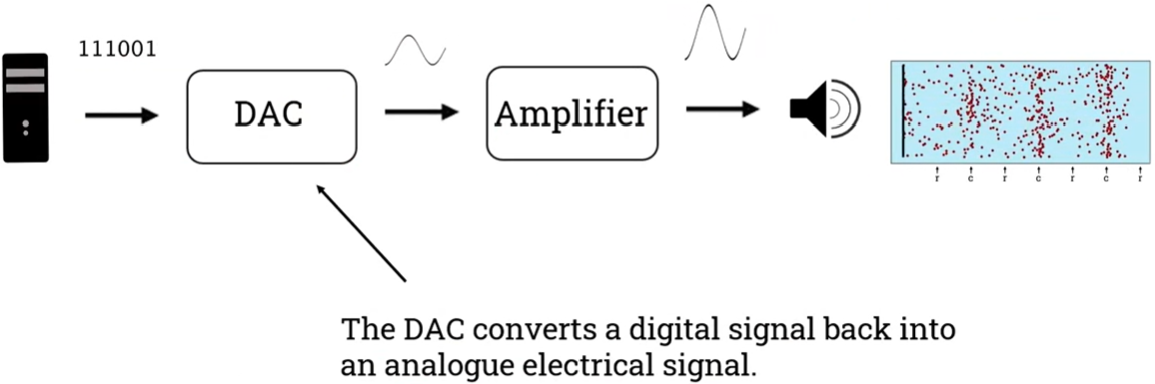- The digital signal is played back and converted to an analogue electrical signal by a DAC.