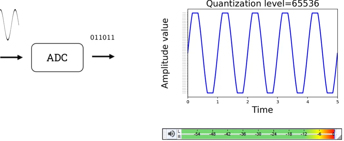Clipping occurs in an ADC when the analog input signal exceeds the converter's maximum capacity. This overload forces the ADC to assign either the maximum or minimum digital value to affected samples, resulting in a flat-topped or flat-bottomed waveform. This distortion is undesirable and should be avoided. If the level meter reads zero (or the clipping indicator turns red), this means the signal is clipping!
