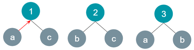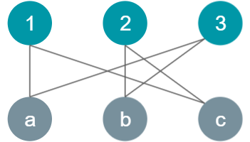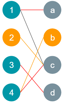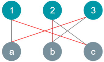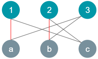 In this iteration, 1 is matched to a, 2 is matched to b, and 3, along with c, is left without a match.