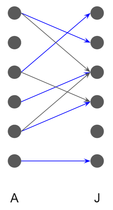 For example, a maximum of five people can get jobs in the following graph of an assignment of jobs to applicants.