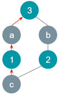 DFS finds a path from c to 1, to 1, and terminates at 3.